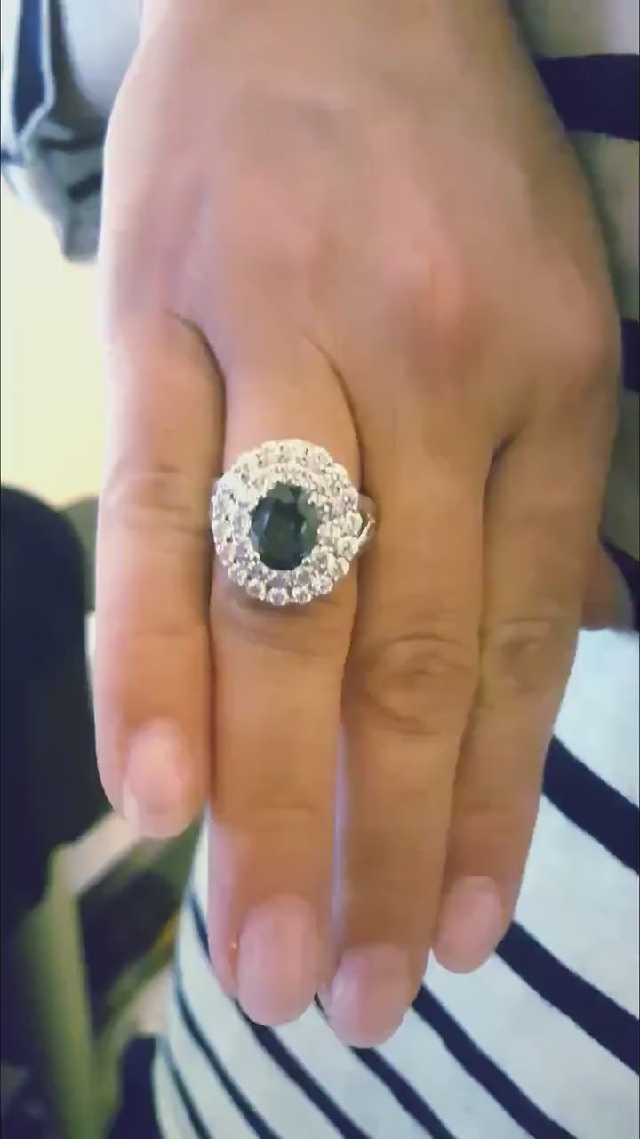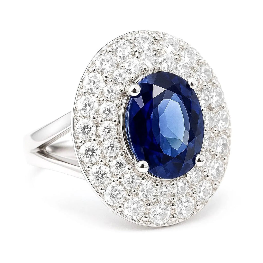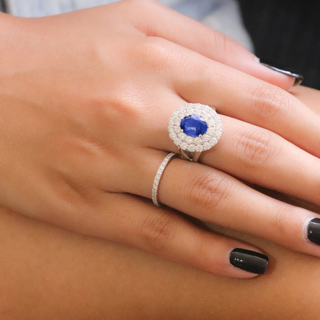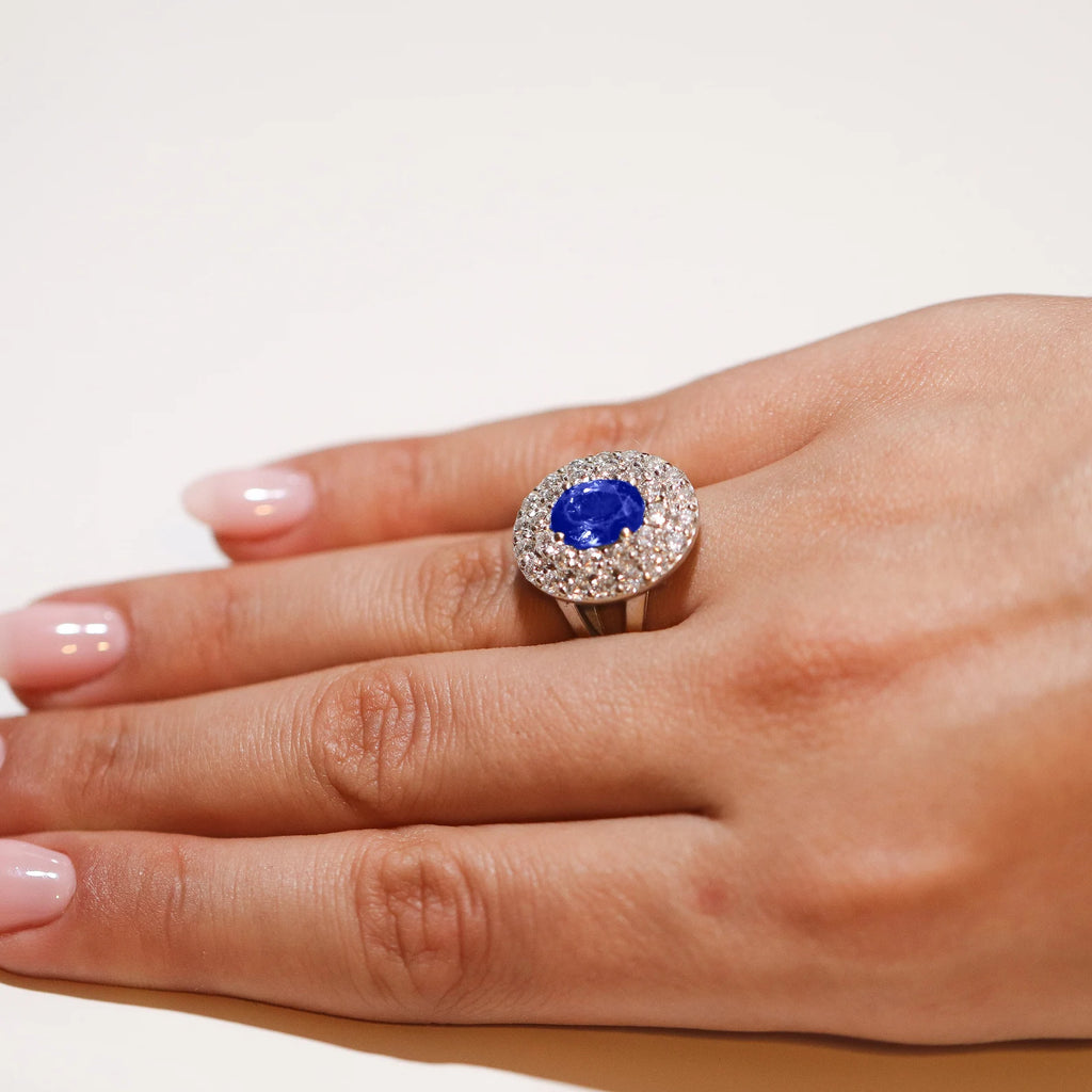 טבעת אירוסין בהשראת וינטג', עשויה בעבודת יד מקצועית מזהב 14 קראט, משובצת ספיר אליפטי כחול עמוק במשקל 2.00+ קראט, ממוסגרת בהילה ונגיעות צד של יהלומים טבעיים במשקל 1.40 קראט. השילוב של ספיר עשיר ויהלומים קורנים יוצר אמירה אלגנטית נועזת אך נצחית.