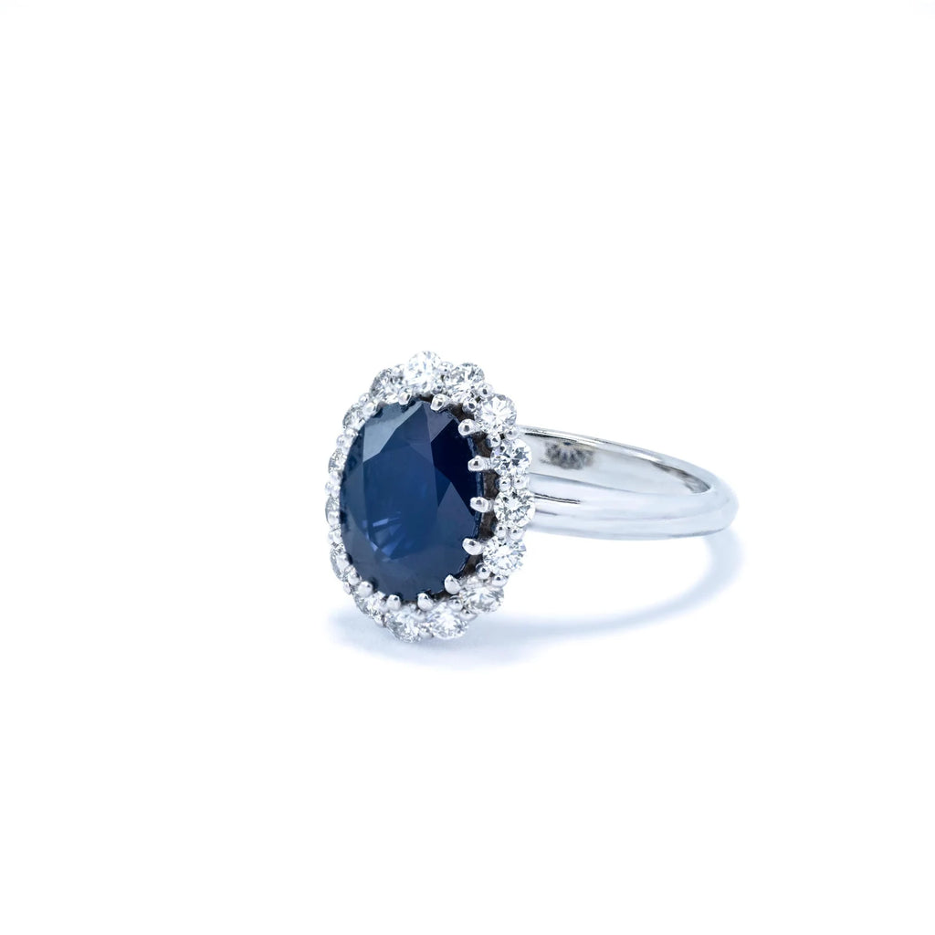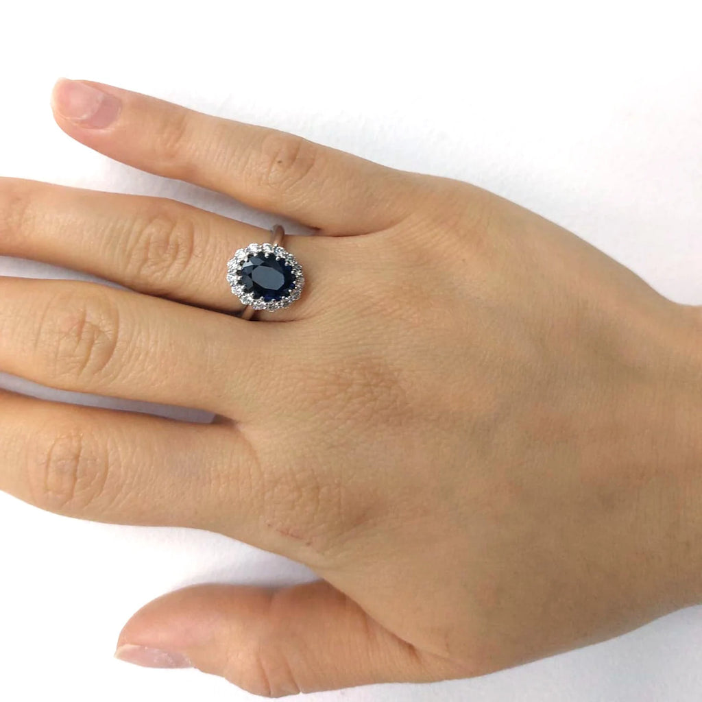 טבעת אירוסין מלכותית זו, עשויה בעבודת יד מזהב 14 קראט מלא, משובצת במרכזה ספיר אליפטי כחול עמוק, מוקפת ביהלומים טבעיים במשקל 1/3 קראט בעיצוב הילה קלאסי. בהשראת הטבעת האייקונית של הנסיכה דיאנה, תכשיט זה מגלם אלגנטיות נצחית וקסם מלכותי.
