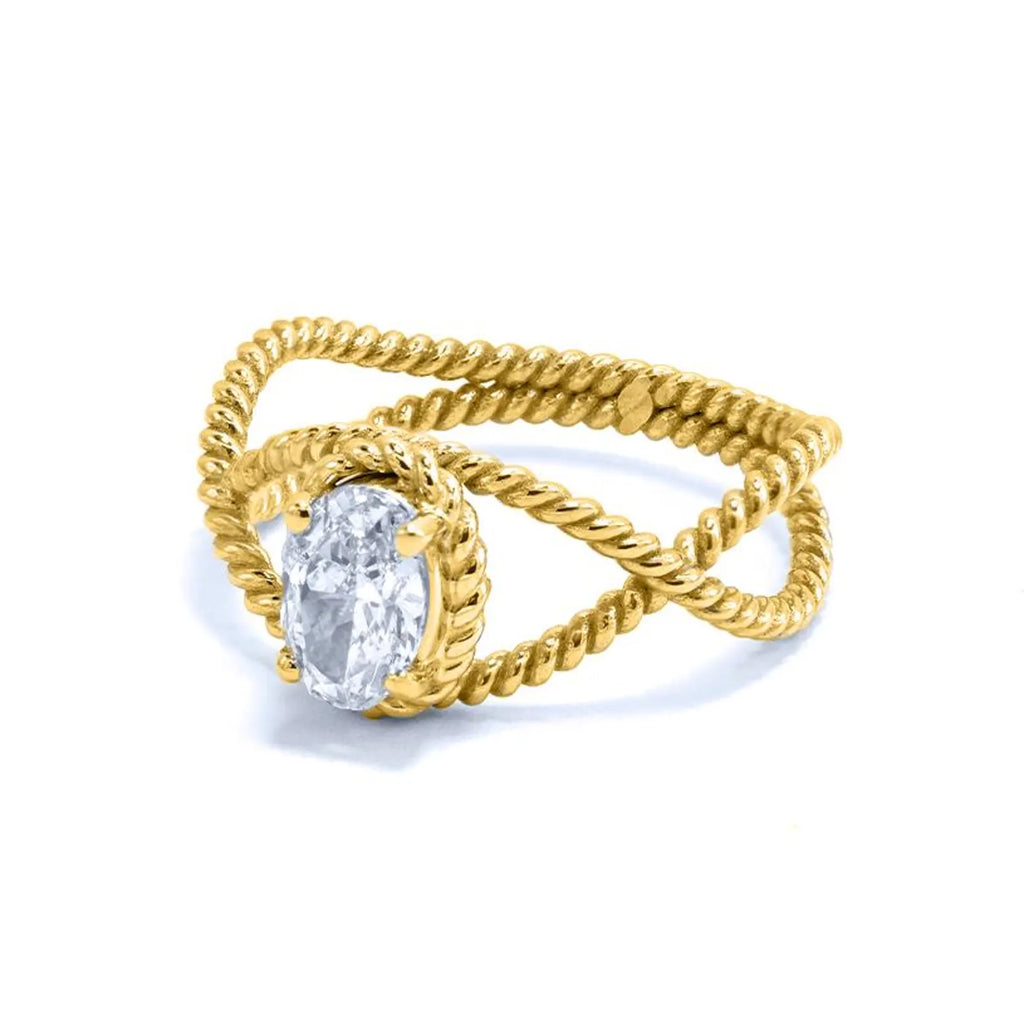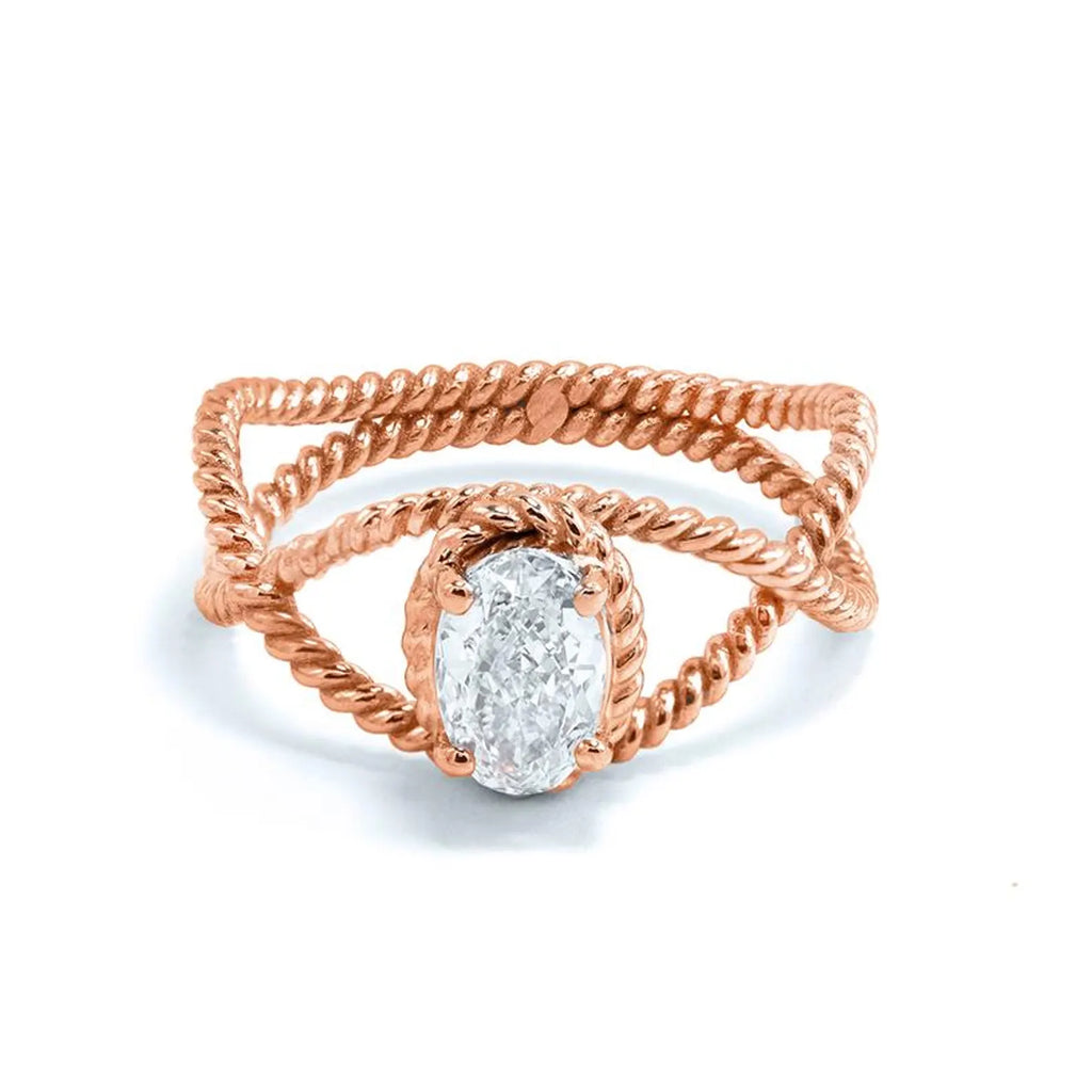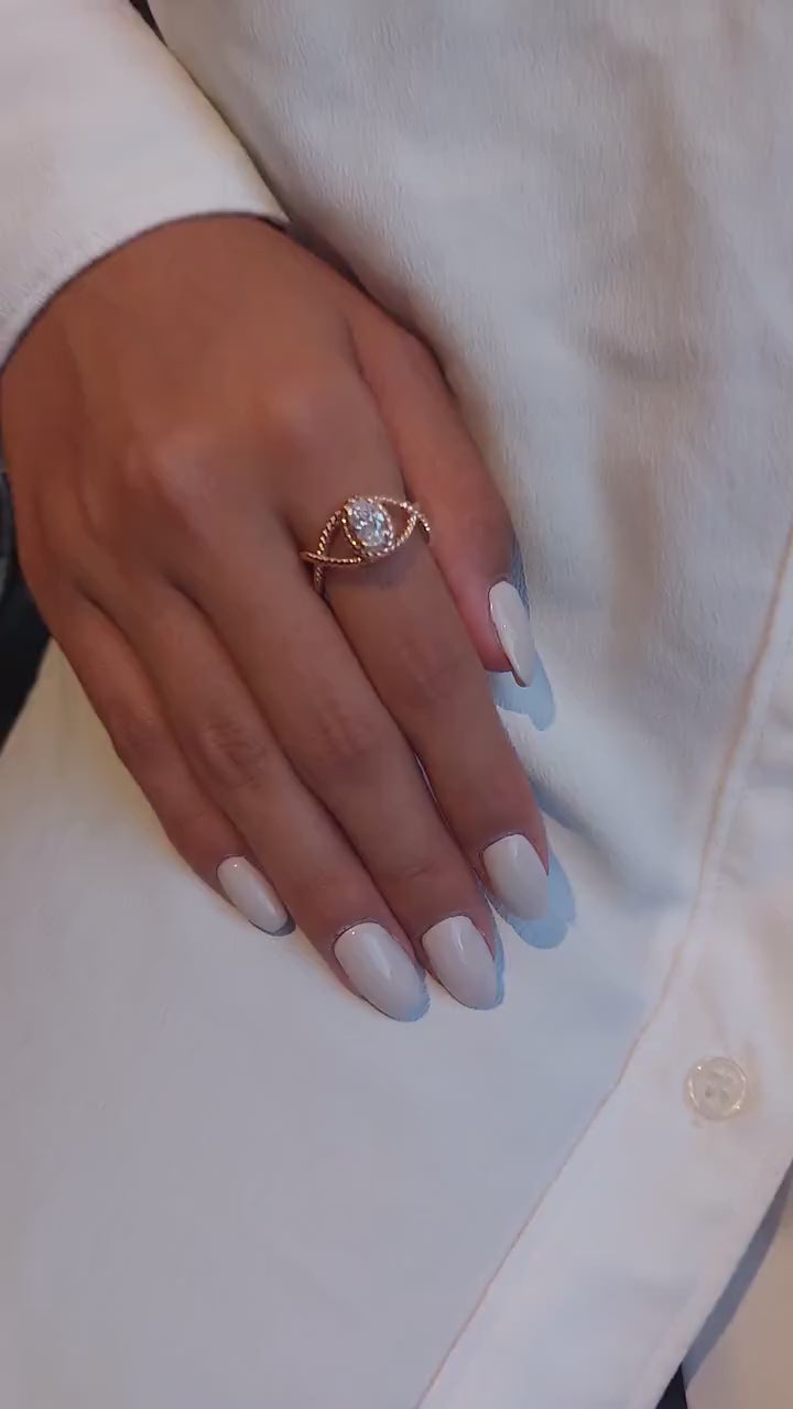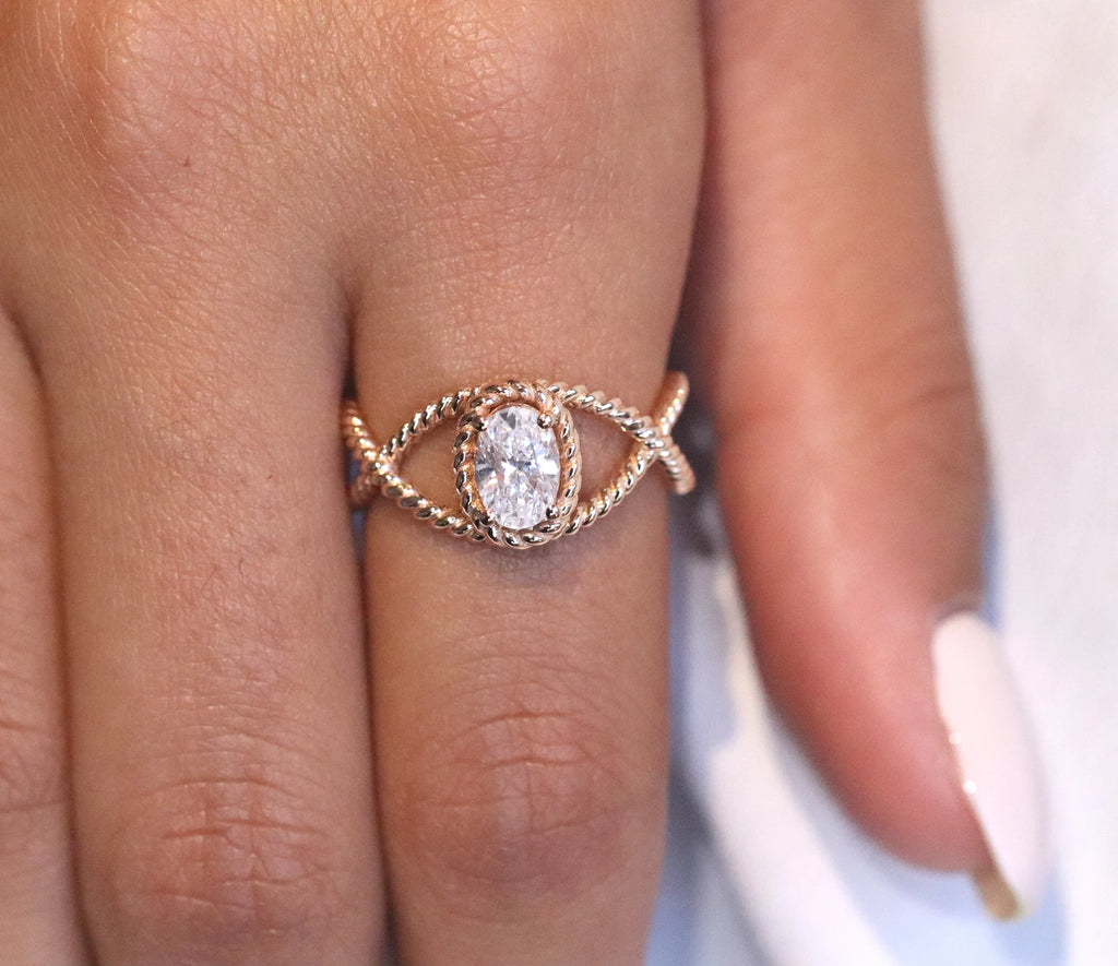 טבעת מעודנת זו עשויה בעבודת יד מזהב 14 קראט מלא ומציגה בלב יהלום סגלגל טבעי מדהים במשקל 0.70 קראט. הטבעת כוללת עיצוב טוויסט אלגנטי, המסמל שני חיים שלובים זה בזה בצורה יפה, בעוד שהיהלום הסגלגל מקרין זוהר וחן נצחי.
