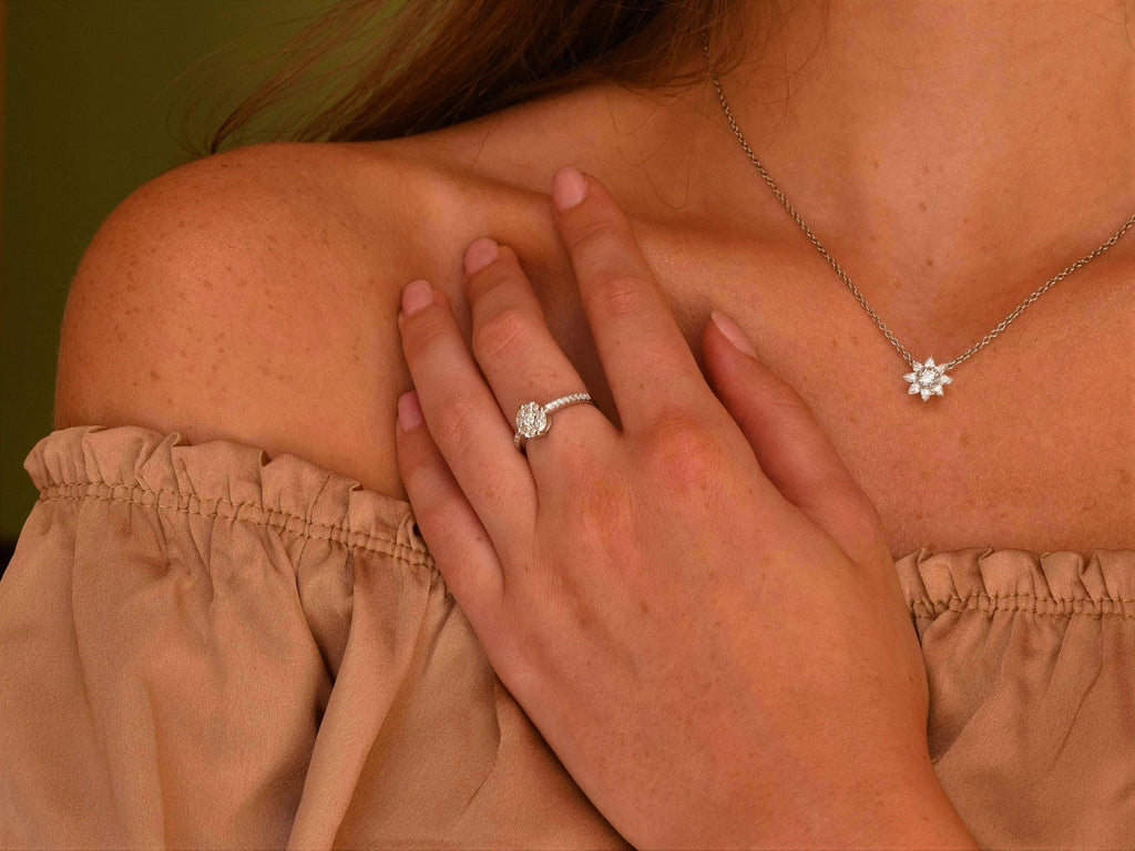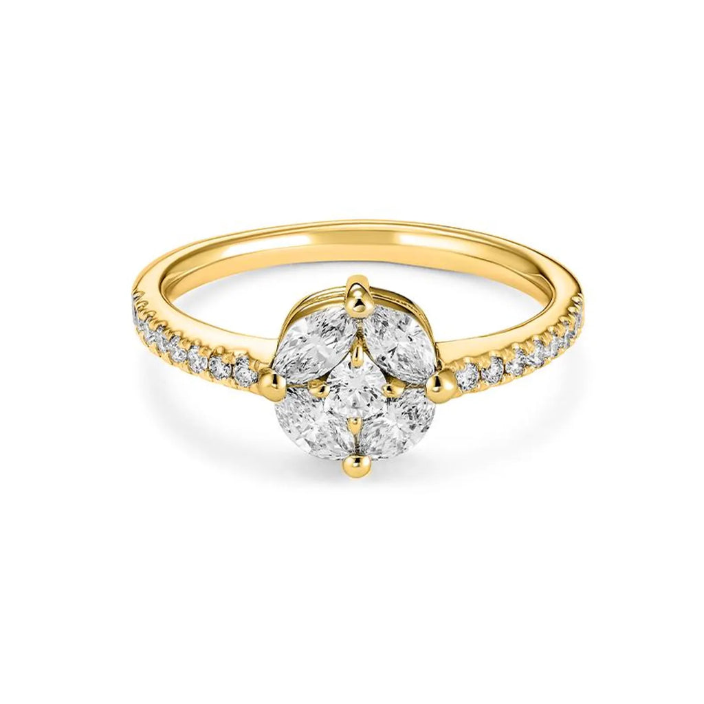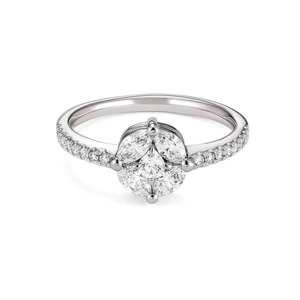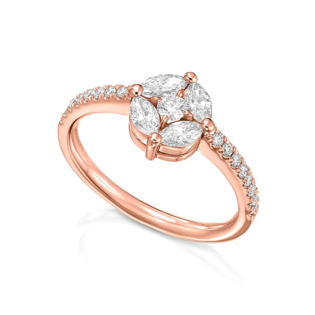 טבעת אירוסין אלגנטית זו, עשויה בעבודת יד מקצועית מזהב 14 קראט, מציגה אשכול יהלומים בצורת מרקיזה, שנועד למקסם את הברק והנצנוץ. צללית המרקיזה המוארכת, המודגשת ביהלומים משובצים בקפידה, יוצרת מראה מרשים שהוא גם חינני וגם נצחי.