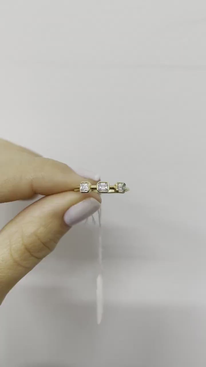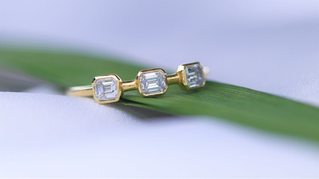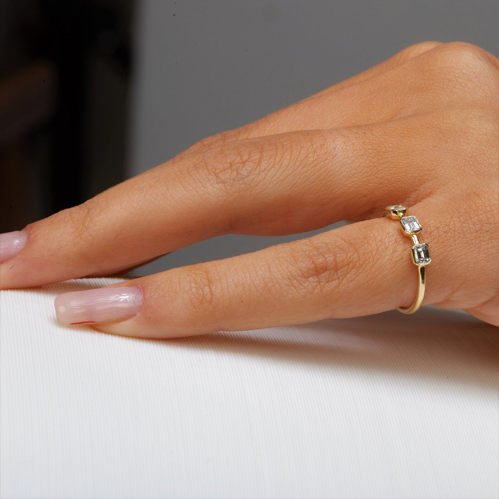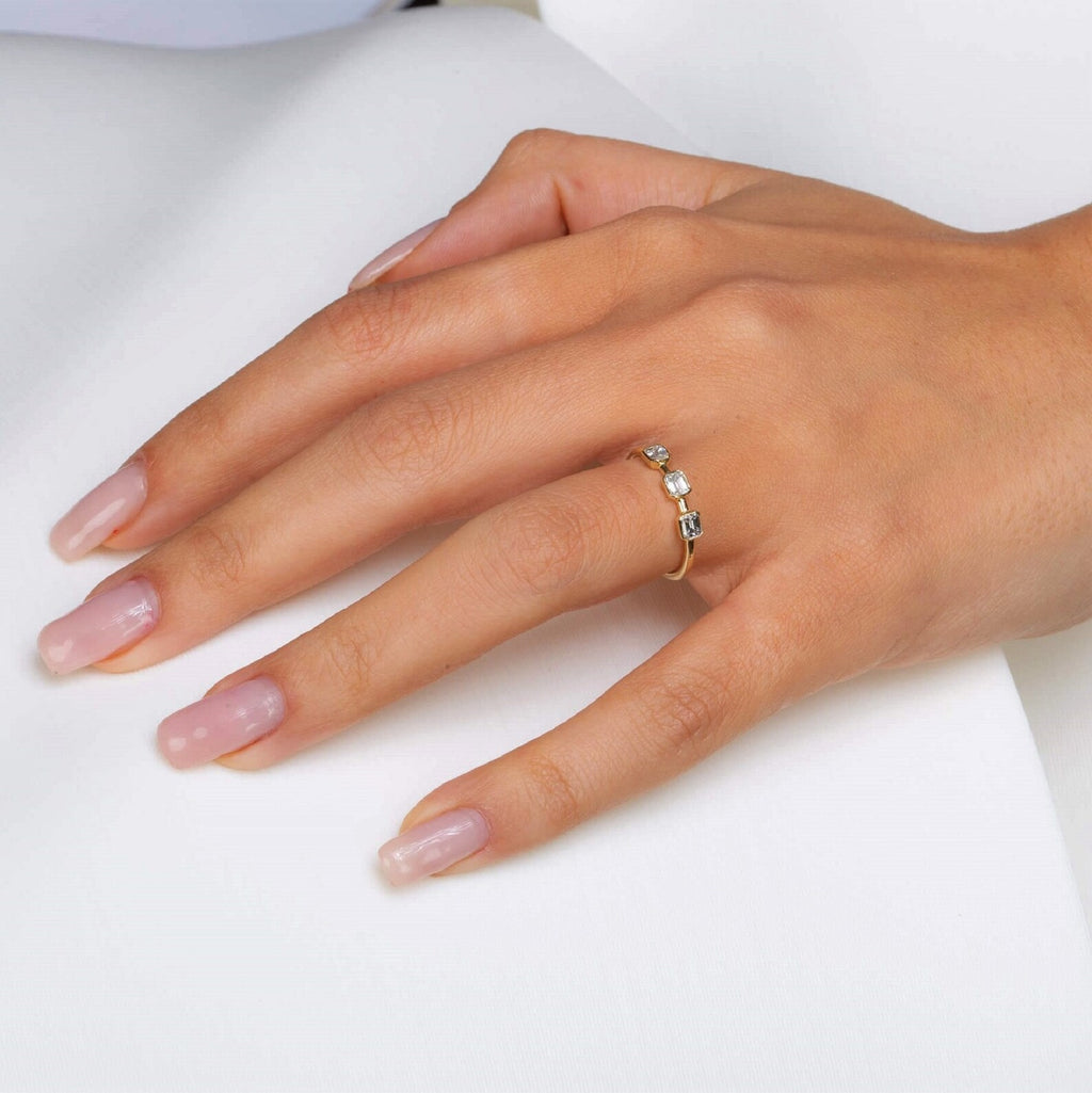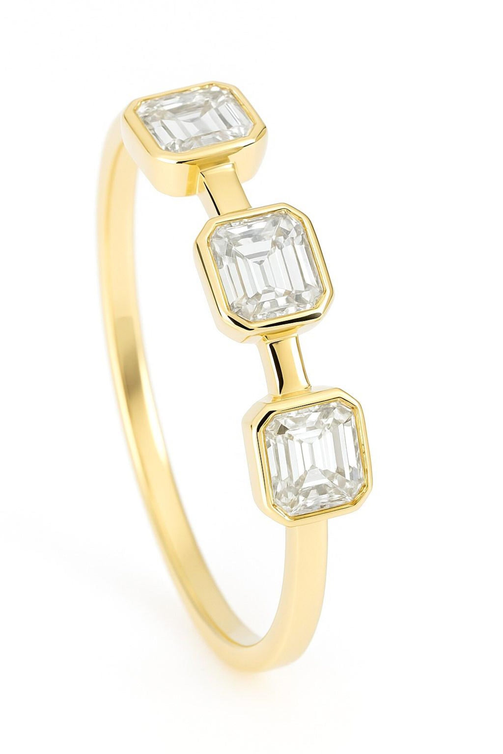 טבעת בצורת אזמרגד משובצת שלוש אבנים בזהב משובץ יהלום