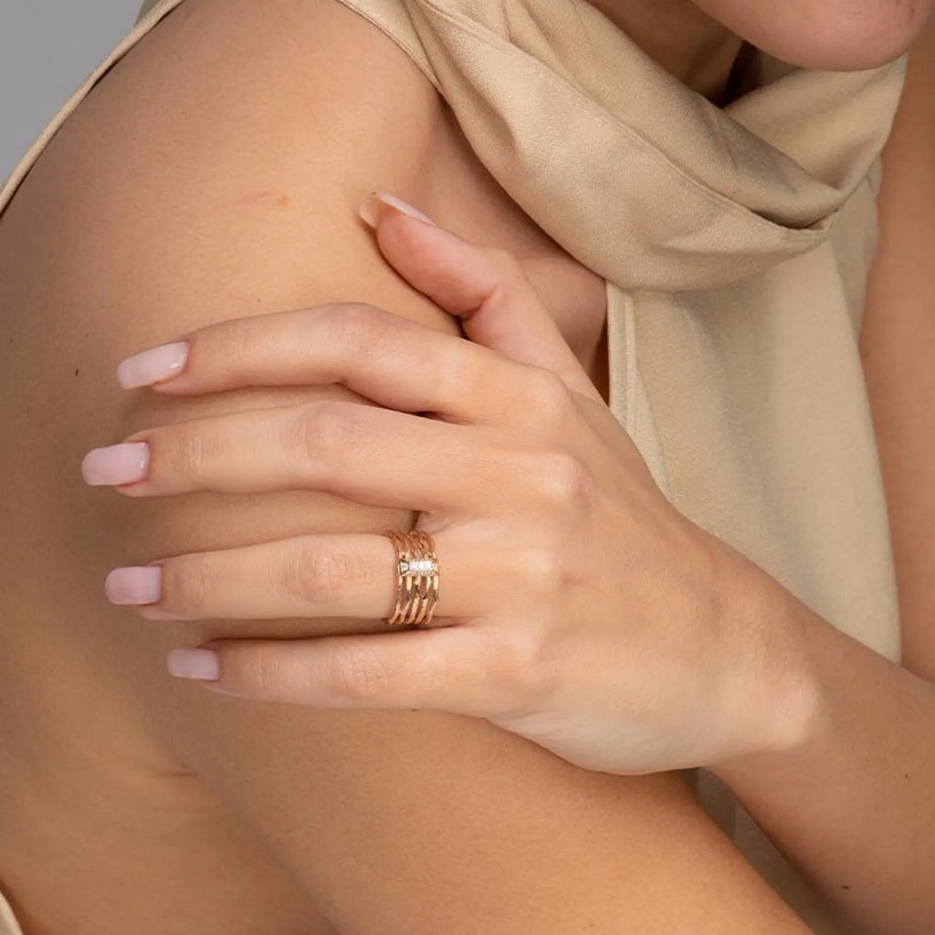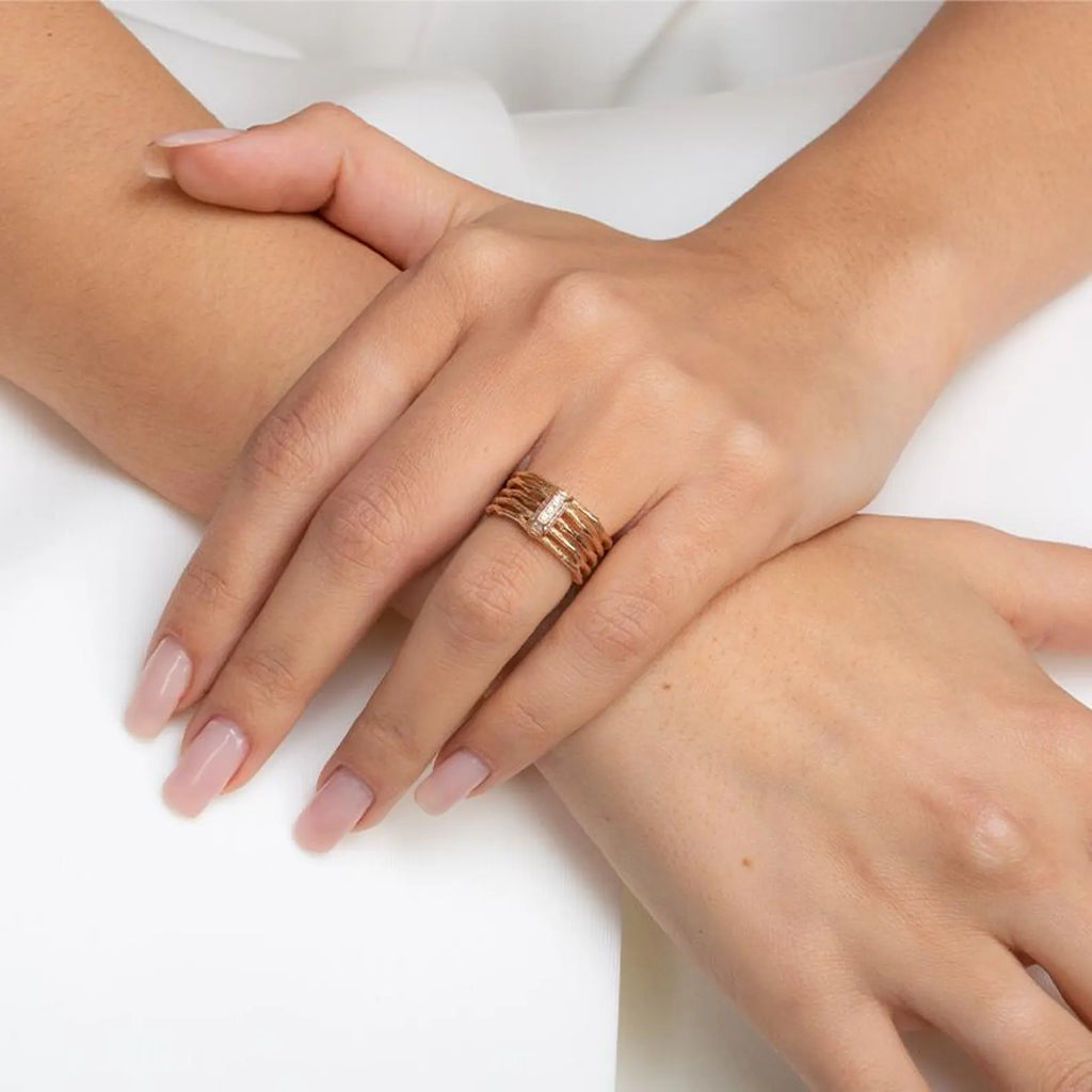 טבעת יהלומים אלגנטית ורב-תכליתית זו עשויה בעבודת יד בקפידה מזהב 14 קראט ומעוטרת ביהלומים טבעיים נוצצים. עיצובה העדין הופך אותה למושלמת לענידה לבד למגע של אלגנטיות מאופקת או לשילוב עם טבעות אחרות ליצירת מראה אישי ומודרני.