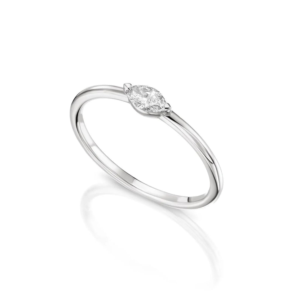 טבעת סוליטר עדינה זו, עשויה בעבודת יד מקצועית מזהב 14 קראט מלא, משובצת ביהלום טבעי בחיתוך מרקיזה במשקל 0.15 קראט, הנערץ בזכות צורתו המוארכת הייחודית וברקו הקורן. עיצובה המינימליסטי מדגיש את יופיו החינני של היהלום, מה שהופך אותו לפריט נצחי שמשלים בקלות כל סגנון.