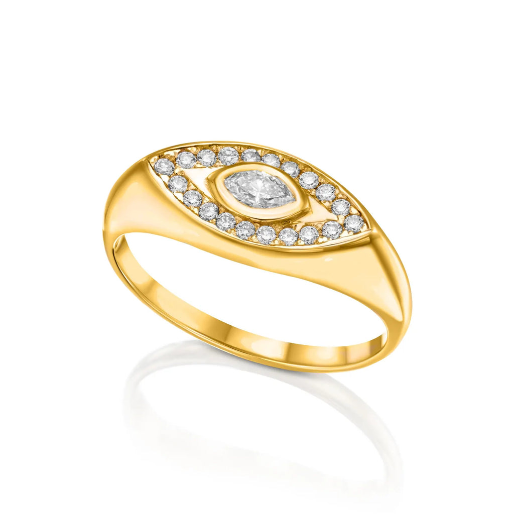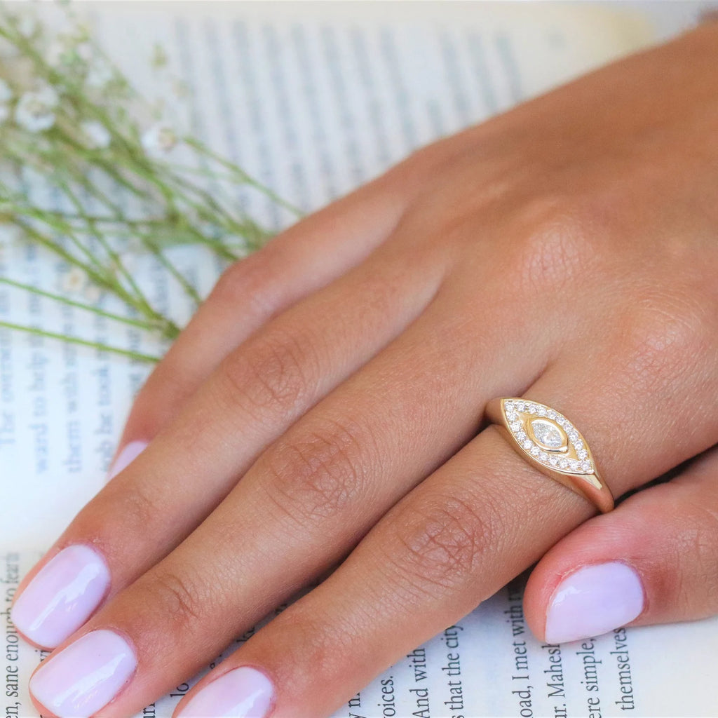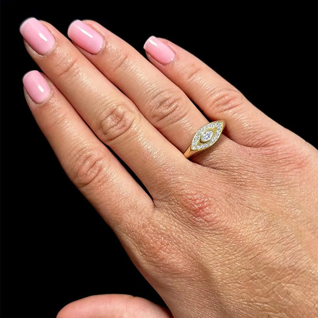 טבעת Pear & Pave V זו, עשויה בעבודת יד עדינה מזהב 14 קראט מלא, משובצת ביהלום חינני בצורת אגס משובץ בשורה של יהלומים נוצצים משובצים בפאבה. העיצוב האלגנטי בצורת V מושך את העין, מסמל כוח, כיוון ויופי של איזון.
