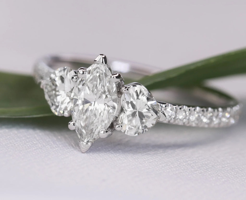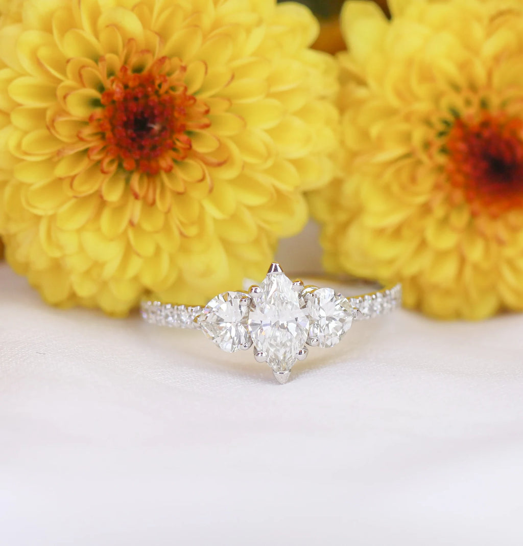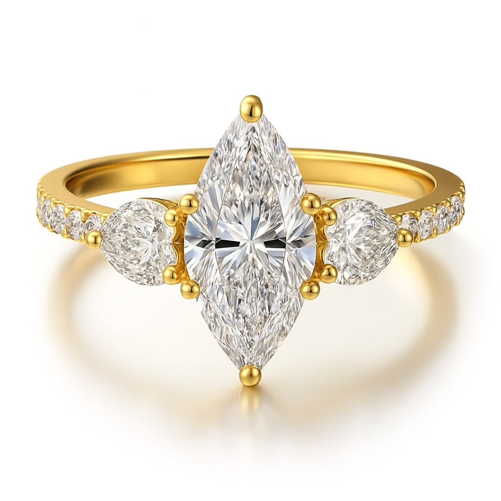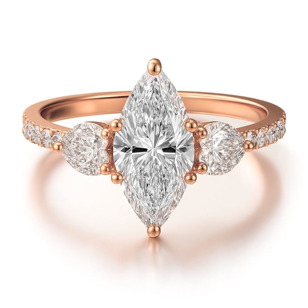 טבעת אירוסין זו, יצירת מופת רומנטית באמת, עשויה בעבודת יד מזהב 14 קראט מלא וכוללת יהלום מרכזי בחיתוך מרקיזה, משובץ בחן בשני יהלומים בצורת לב. עם משקל כולל של יהלומים טבעיים במשקל כולל של 0.90+ קראט, הטבעת מקרינה זוהר, רומנטיקה ואלגנטיות נצחית.